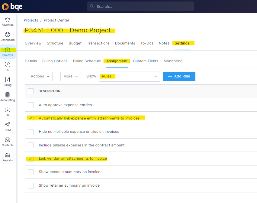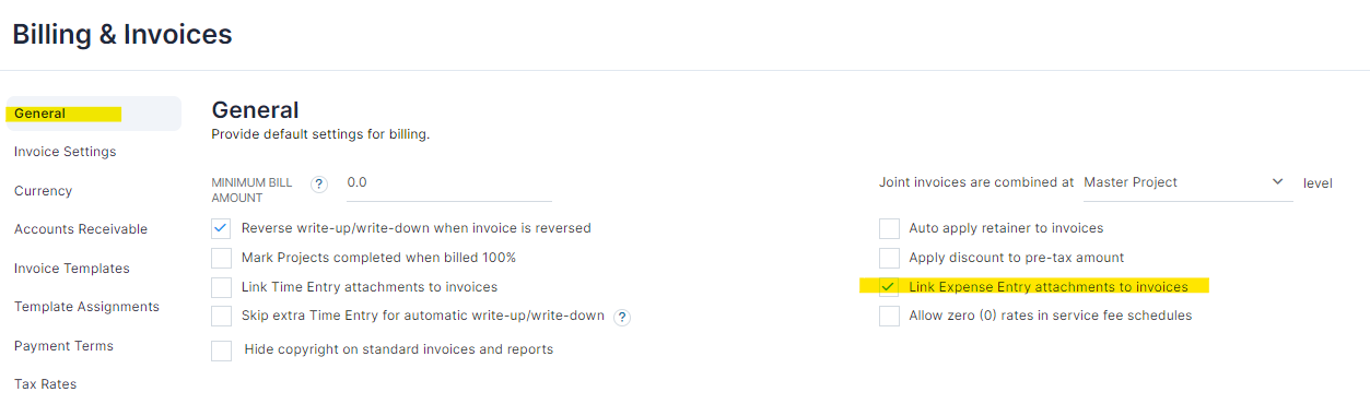 1. Global Setting: BQE Core>Settings>General> Link Expense Entry attachments to invoices. 'Save'