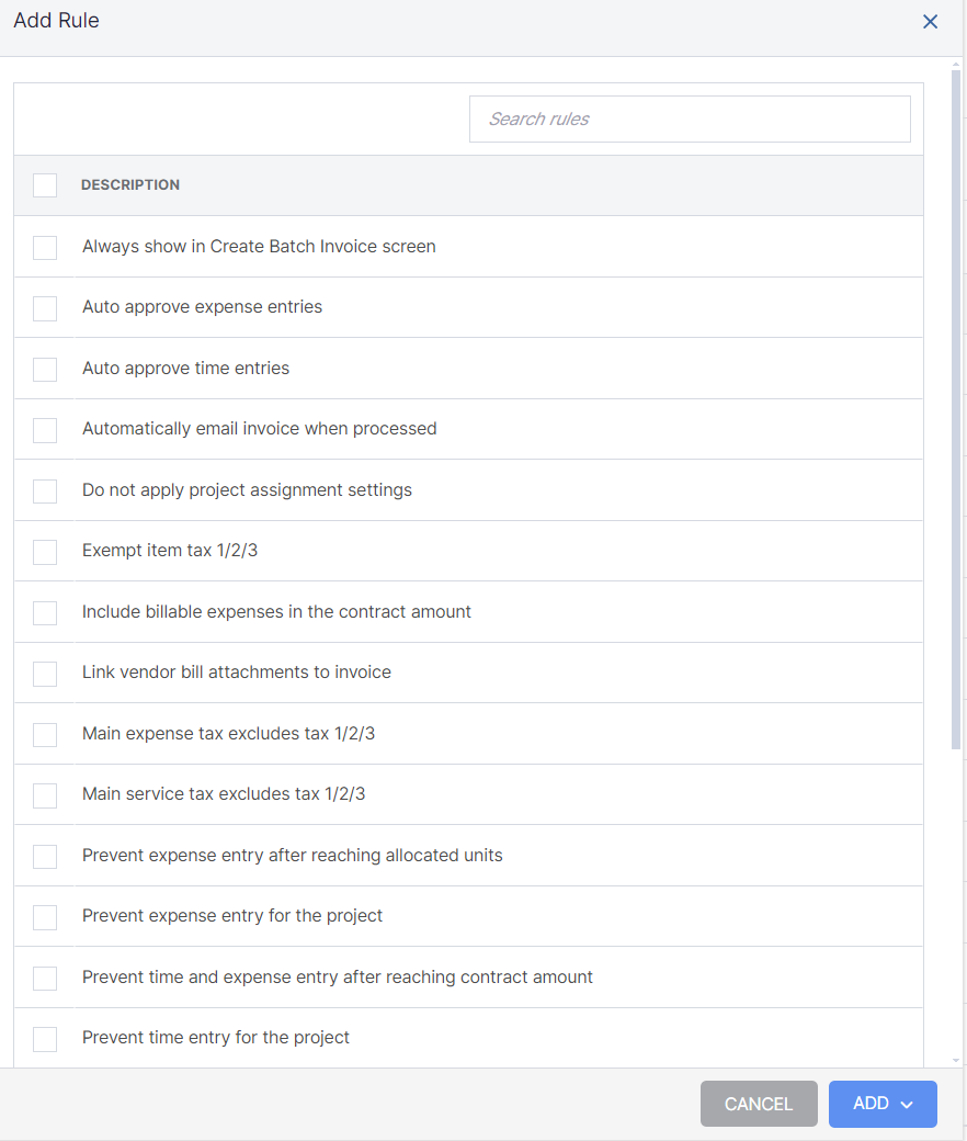 (In the sample below, these rules are active for this project because of their presence on the list. Click 'Add Rule' button to see what additional rules could be added. Checking the box to the left of the Description and choosing 'Delete' from the 'Actions' drop-down list allows you to delete rules.)