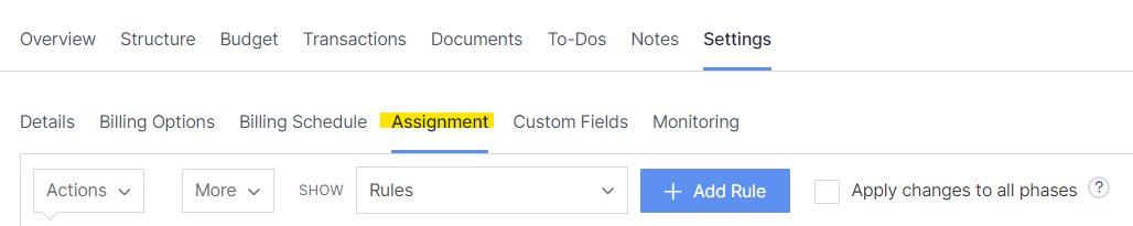 'Open BQE Core'> Click on 'Projects'> search for the project or phase> navigate to the far right for a down arrow and choose 'View Details'. Once in the project or phase details, navigate to 'Settings' and then the 'Assignment' tab