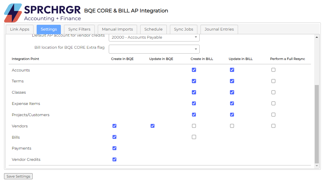 Integration Point Overview: In this section, you get to tell the SPRCHRGR 'Sync Tool' which software application is the source of truth. Using the Accounts integration point as an example, you'll see the only option is to 'Create an Account' or 'Update an Account' in BILL.com. The idea here is that modifications to the 'Chart of Accounts' should be performed in BQE Core and then synced to BILL. BQE Core is the source of truth for the 'Chart of Accounts', '(Payment) Terms', 'Classes', 'Expense Items', 'Projects/Customers'.