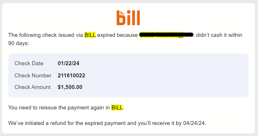UPDATE Void a payment that never cleared the bank Sometimes payments to vendors never clear the bank. Voided transactions do not sync between systems. See the steps below. Bill.com will send an email when the check has expired. Confirm the refund has been received from BILL. Enter a deposit in BQE Core.