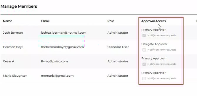 - The Approval Access column gives quick glance into the access currently assigned to all onboarded team members.