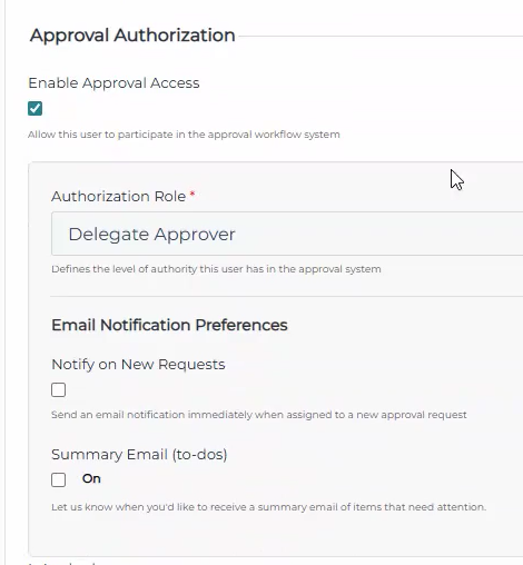 - You'll be redirected to an edit user screen. Scroll down and toggle the Enable Approval Access checkbox to turn access on or off. Using the dropdown, select if you want to make them a primary or delegate approver, as well as the notification settings for this team member. Refer to the articles on Understanding Approver Authorization Roles and Understanding Notification Settings for more details.