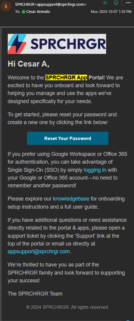 First Time setup reach out to appsupport@sprchrgr.com to whitelist the email of your first Approver