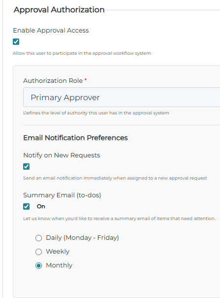 - Enable Approval Access and, under Authorization Role, select Primary Approver or Delegate Approver. Refer to the article on Understanding Approver Authorization Roles for more details.
