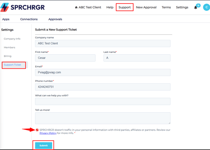 - From the SPRCHRGR App Portal : Dashboard → Support → Fill out the Ticket → Submit